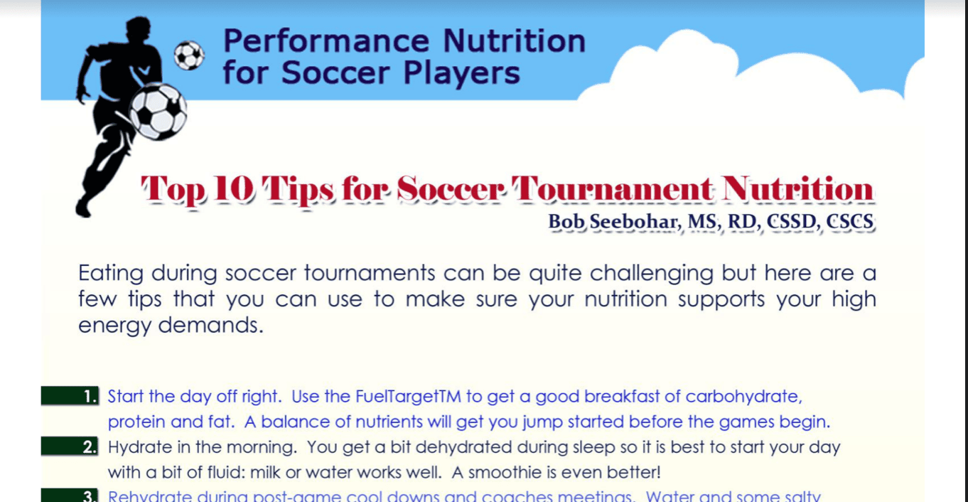 Click here for more information on nutrient timing and other ideas for pre-practice/game foods for soccer players.