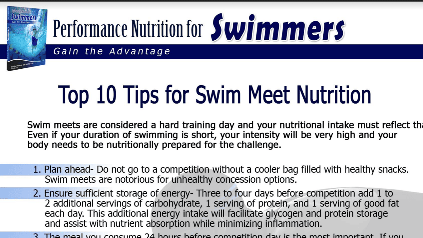 Here, you will find My Sports Dietitian’s eBook for swimmers, which provides information on the unique, science-based nutritional requirements of swimmers, sample eating plans, athlete-tested recipes, information on how to properly fuel for swim meets, and much more. By using this knowledge, along with real life tactics and techniques, you will be able to take your swimming to the next level.